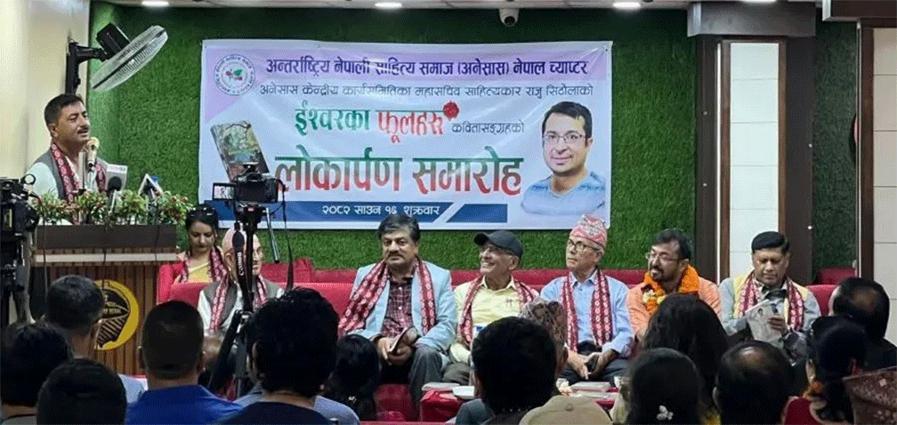 काठमाडौं/ अन्तर्राष्ट्रिय नेपाली साहित्य समाज (अनेसास) नेपाल च्याप्टरको आयोजनामा कवि तथा अनेसास केन्द्रीय महासचिव राजु सिटौलाद्वारा लिखित कवितासंग्रह ‘ईश्वरका फूलहरू’ को लोकार्पण कार्यक्रम गत शुक्रबार यहाँ सम्पन्न भयो ।