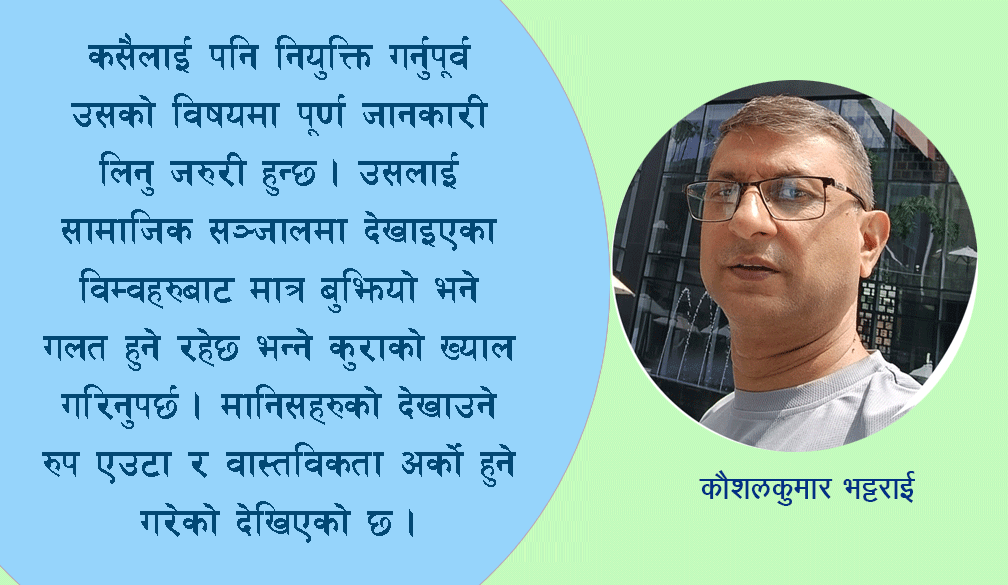 कसैलाई पनि नियुक्ति गर्नुपूर्व उसको विषयमा पूर्ण जानकारी लिनु जरुरी हुन्छ । उसलाई सामाजिक सञ्जालमा देखाइएका विम्वहरुबाट मात्र बुझियो भने गलत हुने रहेछ भन्ने कुराको ख्याल गरिनुपर्छ । मानिसहरुको देखाउने रुप एउटा र वास्तविकता अर्को हुने गरेको देखिएको छ ।