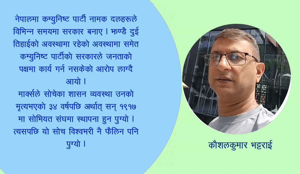 नेपालमा कम्युनिष्ट पार्टी नामक दलहरुले विभिन्न समयमा सरकार बनाए । झण्डै दुई तिहाईको अवस्थामा रहेको अवस्थामा समेत कम्युनिष्ट पार्टीको सरकारले जनताको पक्षमा कार्य गर्न नसकेको आरोप लाग्दै आयो । यही २०८२ सालको भदौ २३ र २४ गते भएको नवपुस्ता (जेन–जी) को आन्दोलनबाट नेकपा (एमाले) को नेतृत्वमा रहेको सरकार ढल्न पुग्यो । अहिले भने स्वतन्त्र नागरिक सुशीला कार्कीको नेतृत्वमा नयाँ सरकार बनी चुनाव गराउने कार्यमा लागेको छ ।