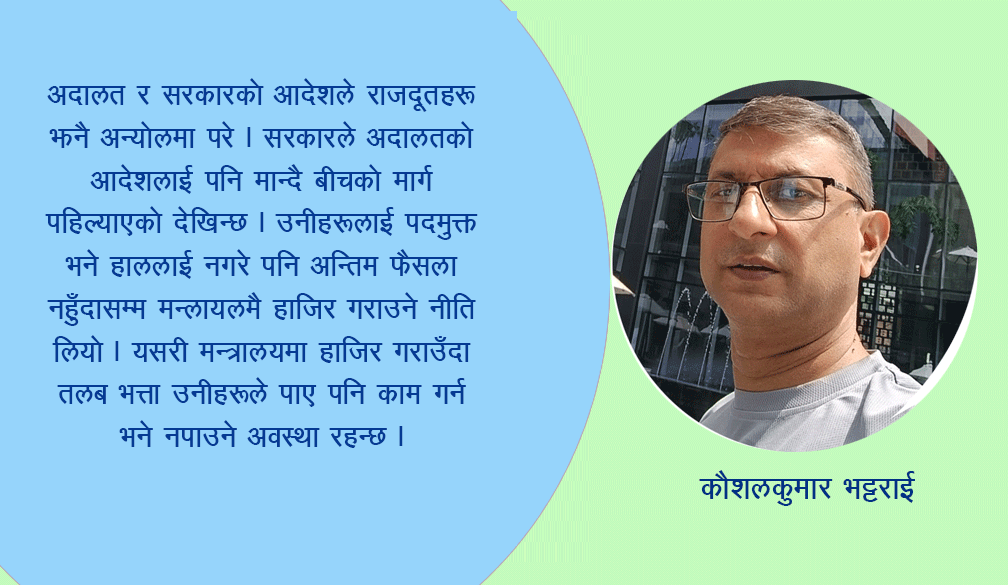 विभिन्न देशहरुका लागि नियुक्त राजदूतहरूलाई नेपाल फर्काउने नेपाल सरकारको निर्णय र त्यस विषयमा सर्वोच्च अदालतले दिएको आदेशले पछिल्लो हप्ता चर्चा पायो । सुशीला कार्की नेतृत्वको वर्तमान सरकारले ११ देशका राजदूतहरुलाई यही कार्तिक २० गते भित्र नेपाल फिर्ता हुनु भनी पदमुक्त गर्ने निर्णय गरेको थियो । सरकारको उक्त निर्णयको विरुद्धमा सर्वोच्च अदालतमा रिट निवेदन प¥यो । त्यसमाथि अदालतले एउटा आदेश दिँदै अन्तिम फैसला नभएसम्मका लागि उनीहरुलाई यथास्थितिमा रहन दिनु भन्यो ।